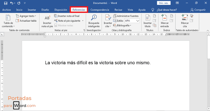 Paso 1: Escribe la frase que debes citar y coloca el cursor justo al final de la misma y dirígete a la pestaña “Referencias” que verás en la sexta posición en el menú principal de Word.