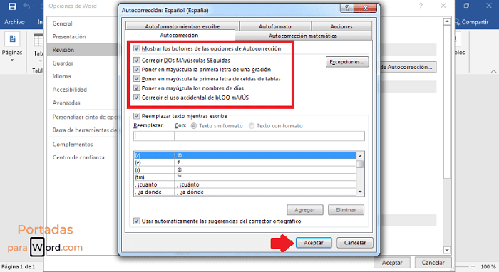 Paso 3: En el cuadro que aparecerá, podrás marcar y desmarcar las opciones que quieres que el autocorrector revise o que omita, de acuerdo a tus gustos. Y cuando termines da clic en «Aceptar».
