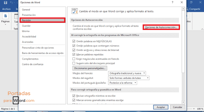 Paso 2: Desde allí da un clic en “Revisión” y luego da clic sobre “Opciones de autocorrección”.
