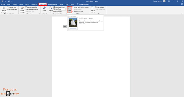 Paso 1: Selecciona el objeto que deseas convertir en un título. En la pestaña “Referencias”, ve al grupo “Títulos” y da clic en la opción “Insertar título”.