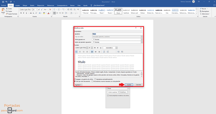 Paso 2: Luego da clic en «Modificar», y así podrás personalizar tus títulos en diferentes aspectos como tamaño de la fuente, la fuente, alineación, sangría, espacio entre líneas y énfasis. Cuando termines da clic en «Aceptar».